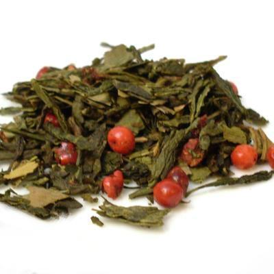 Chá verde com pimenta rosa aromatizado com morango. ..